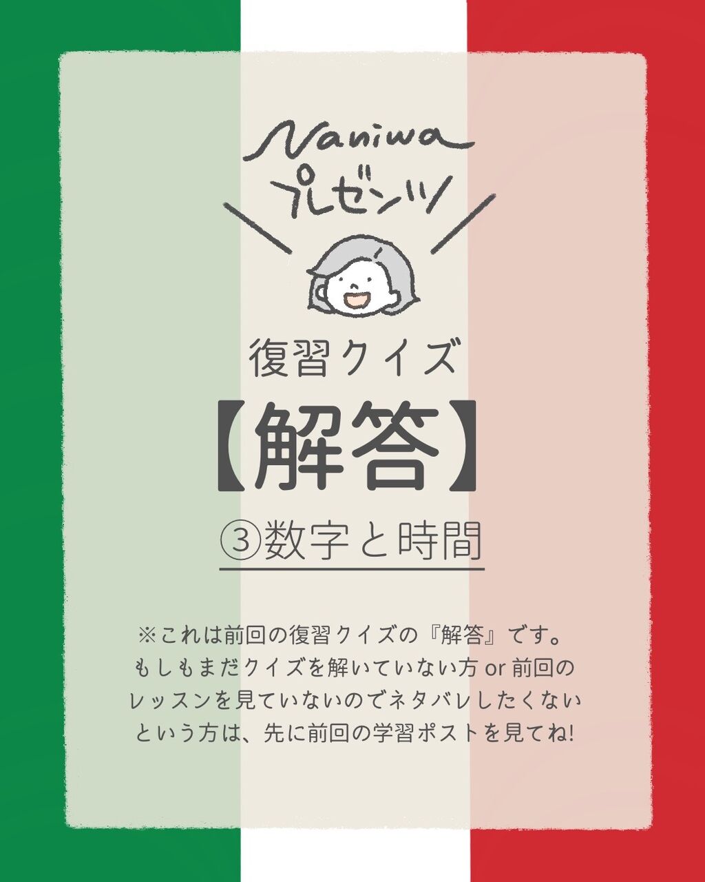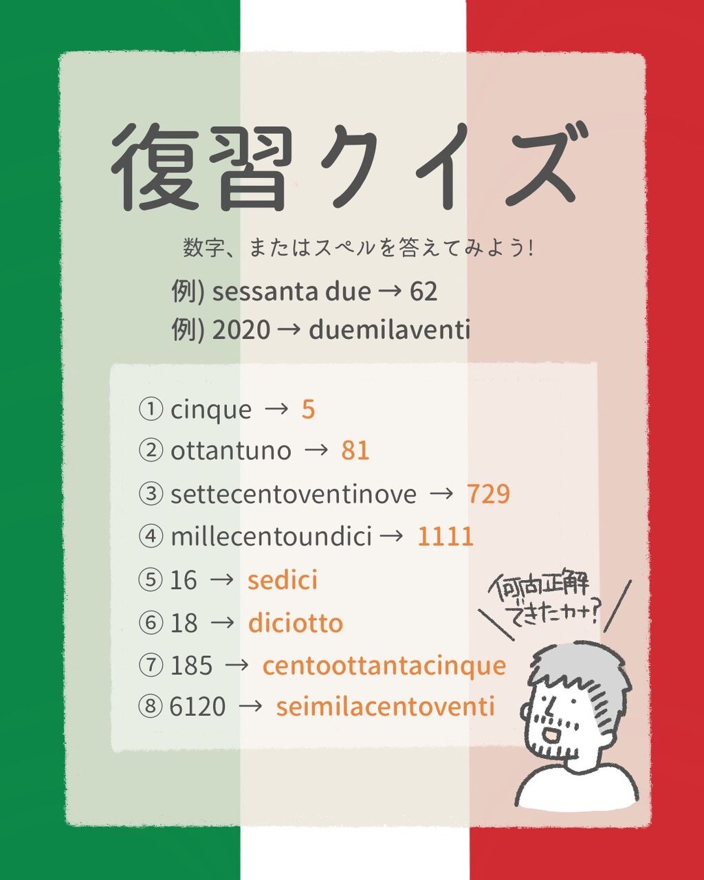 【復習クイズ解答】③数字と時間 2021年12月07日 21:00 Ciao a Tutti!前回の復習クイズの解答です!⬇︎「まだクイズ解いてないんですが!?」という方は、先にこちらへアンディアーモ! 「もうクイズ解いて準備バッチリ!」な方は、解答をどうぞ〜♪さて、何問正解できましたか?しっかり復習して全問正解だったら、今日はちょこっと贅沢なおやつを食べちゃおうぜー!!🤗「まぁ余裕でしたけど?」て方も、拍手でぜひ教えて下さいね👏💕⬇︎次のレッスンはこちら***************************⬇︎ブログランキングに参加しています♪「今日も読んだよ!」の代わりに1日1回、下の2つのタグをポチッと押して応援してくれたら嬉しいです♪みなさんの応援が更新の励みになります🇮🇹🇯🇵💕 ⬇︎LINEで更新通知が届きます♪登録すると、LINEで読めます📩 < 前の記事次の記事 > コメント コメント一覧 (2) 1. neko 2021年12月10日 09:57 書くのは覚えられない。😢6と7が難しく、60と70は混乱。4と5もちょっと難しかった。皆さんはどうなのだろう? 0 なにわ がしました 2. なにわ 2021年12月13日 00:55 >> nekoさん スペルちょっとややこしいですよね💦私も15とか50でいつもつっかかります😅インスタのコメントを見てると、スペイン語をやってた方は結構スッと入るみたいですよ👀✨スペイン語できない私たちは気長に覚えていくしかない…!笑 0 なにわ がしました コメントフォーム 名前 コメント 記事の評価 リセット リセット 顔 星 情報を記憶 コメントを投稿する