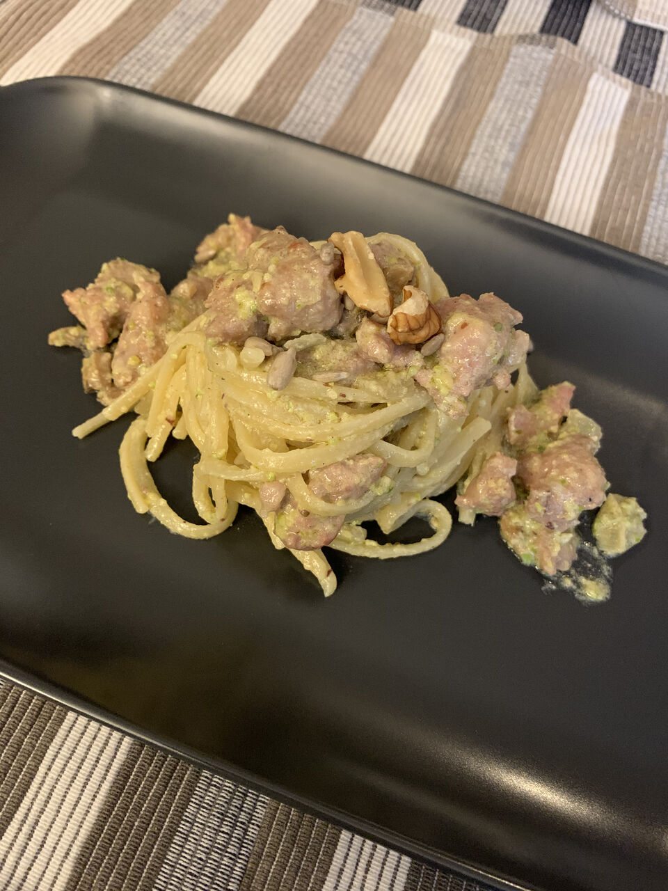 ⬇︎サルシッチャとクルミのピスタチオペストパスタ