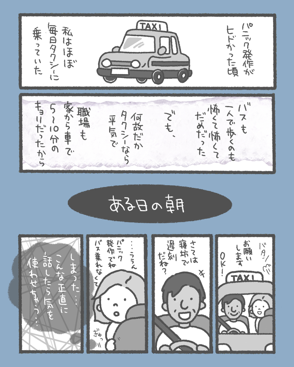 コメントありがとうございます!ベッキーさんもパニック障害をお持ちとのこと、お辛いですよね😢こちらこそ、私の拙いマンガを読んでいただいてありがとうございます。運転手さんが言ってくれたように、必ず大丈夫な日は来るのでお互い無理せずゆっくりいきましょうね😊✨