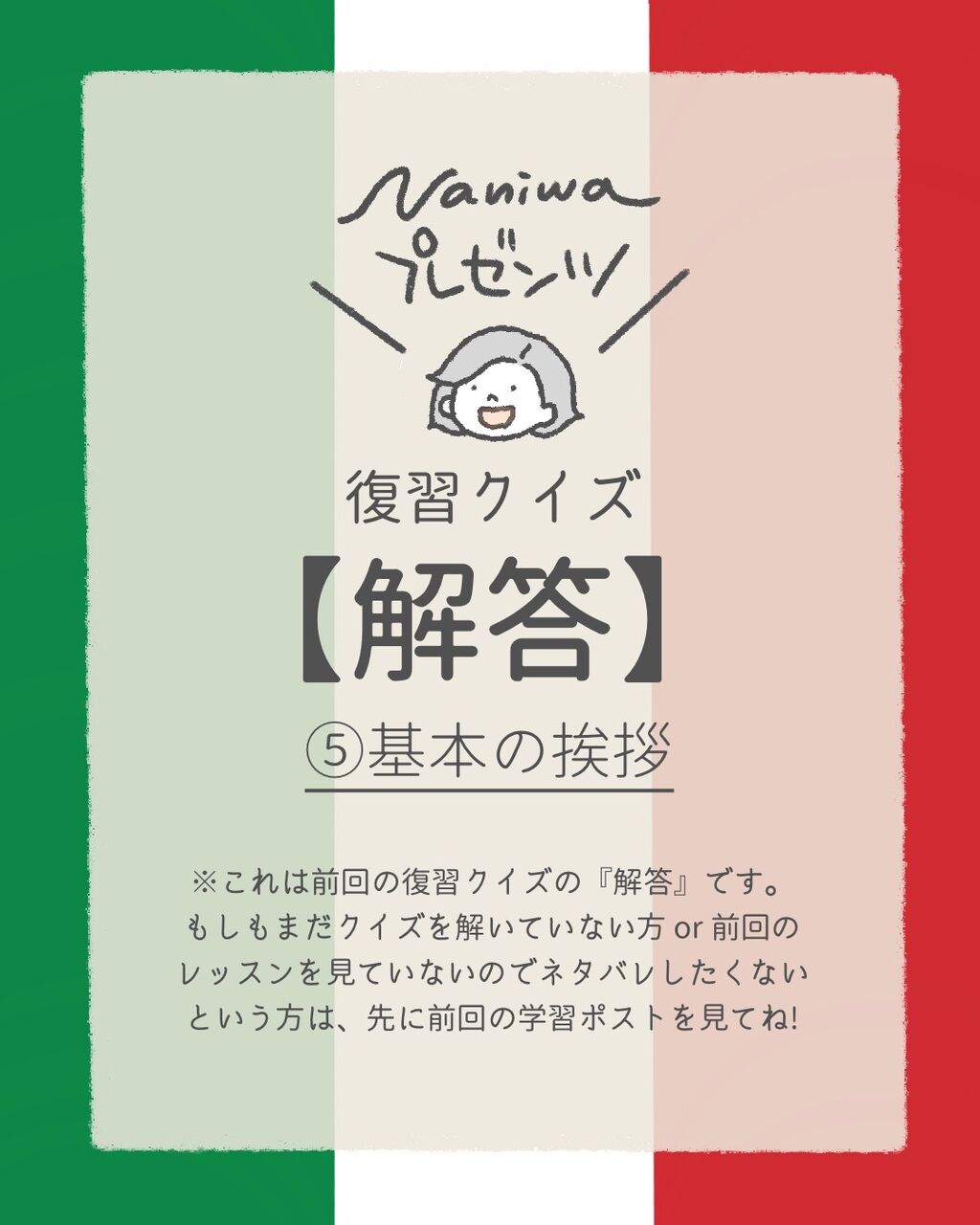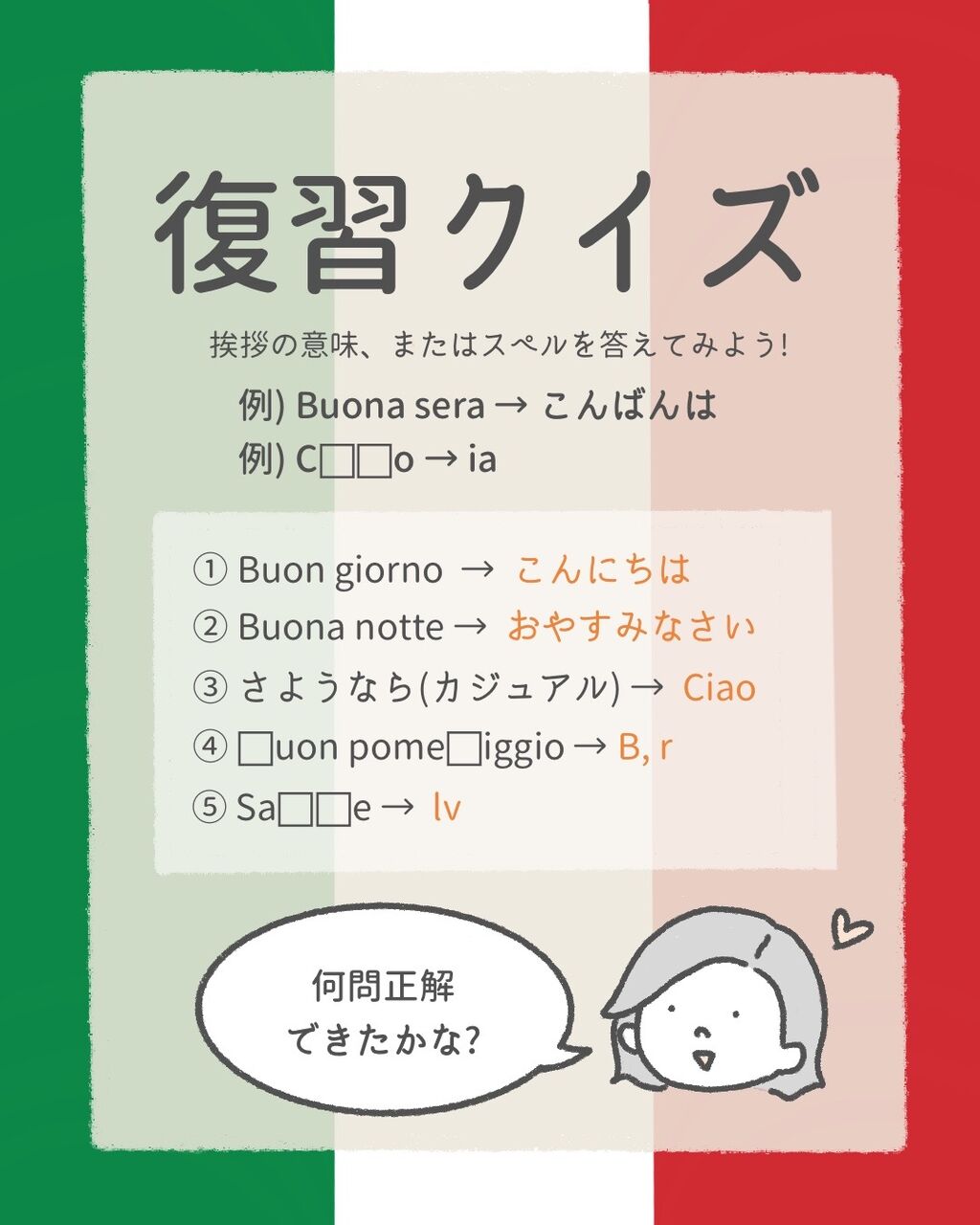 【復習クイズ解答】⑤基本の挨拶 2022年04月13日 07:00 ブログの閲覧、いつもありがとうございます😊💕⬇︎はじめましての方はお先にこちらをどうぞCiao a Tutti!前回の復習クイズの解答です!⬇︎「まだクイズ解いてないんですが!?」という方は、先にこちらへアンディアーモ! 「もうクイズ解いて準備バッチリ!」な方は、解答をどうぞ〜♪さて、何問正解できましたか?しっかり復習して全問正解だったら、今日朝イチでラッキーなことが起こる魔法をかけておきます!🤗「まぁ余裕でしたけど?」て方も、拍手でぜひ教えて下さいね👏💕⬇︎次のレッスンはこちら***************************⬇︎ブログランキングに参加しています♪「今日も読んだよ!」の代わりに1日1回、下の2つのタグをポチッと押して応援してくれたら嬉しいです♪みなさんの応援が更新の励みになります🇮🇹🇯🇵💕 ***************************⬇︎LINEで更新通知が届きます♪登録すると、LINEで読めます📩 < 前の記事次の記事 > コメント コメントフォーム 名前 コメント 記事の評価 リセット リセット 顔 星 情報を記憶 コメントを投稿する