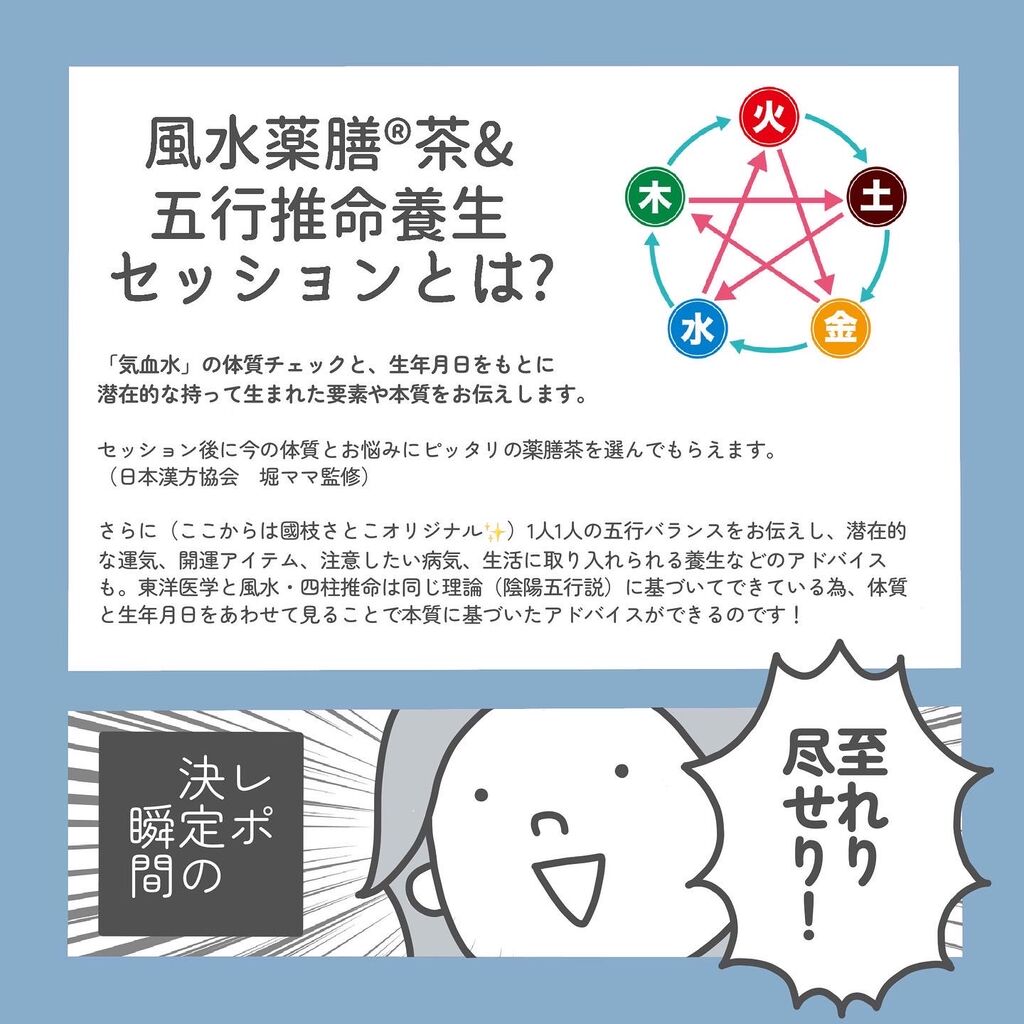 先日國枝さとこさんの風水薬膳®︎茶&五行推命養生セッションを受けたので、その様子を漫画にしてみました〜!