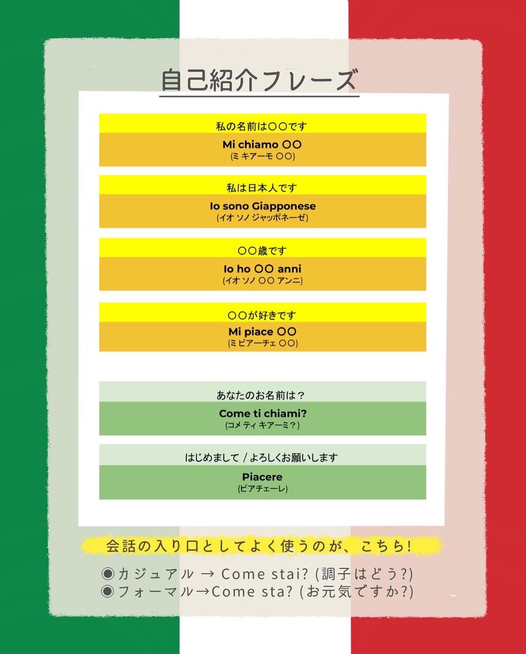 国籍は例として日本人にしましたが、そこは自由に変えてくださいね😊あと「好きなもの」についてはMi piaci の後に名詞を入れるイメージです。