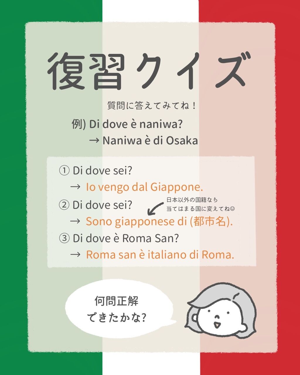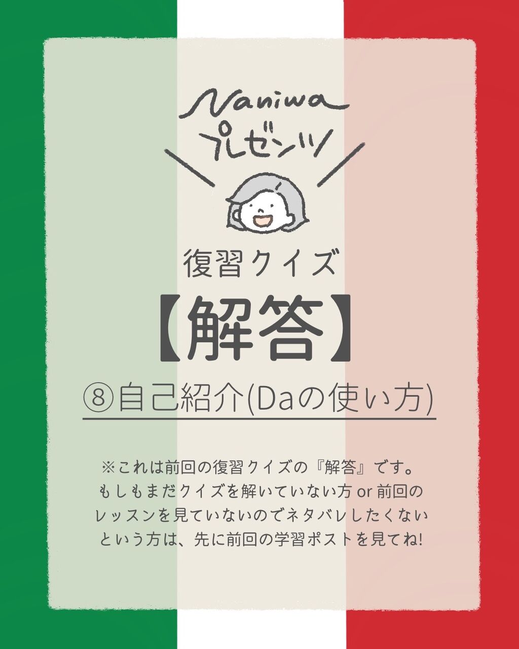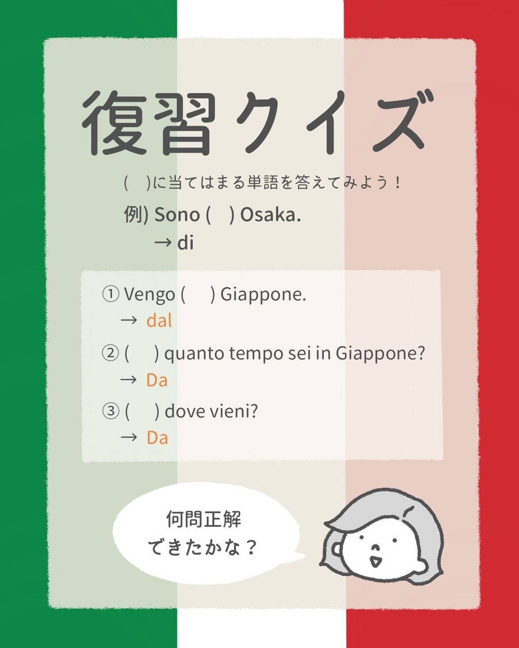 今回は結構簡単だったのではないかな〜✨Da+定冠詞の形は、そのあとに続く女性名詞と男性名詞によって変わるので、もう私は自分の出身の国であるGiappone (日本) には「dal」がつく!とだけとりあえず覚えています笑