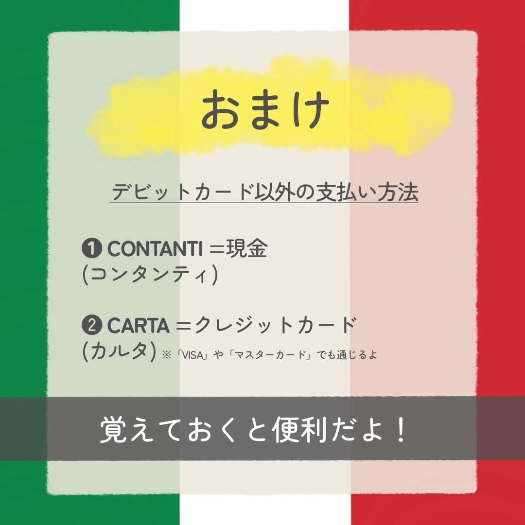 そして支払い方法。コロナ後は結構どこの国でもキャッシュレスが多くなったんじゃないかなと思うんですが、イタリアも同じでほとんどがカード決済です。(アプリはあまり見かけない)